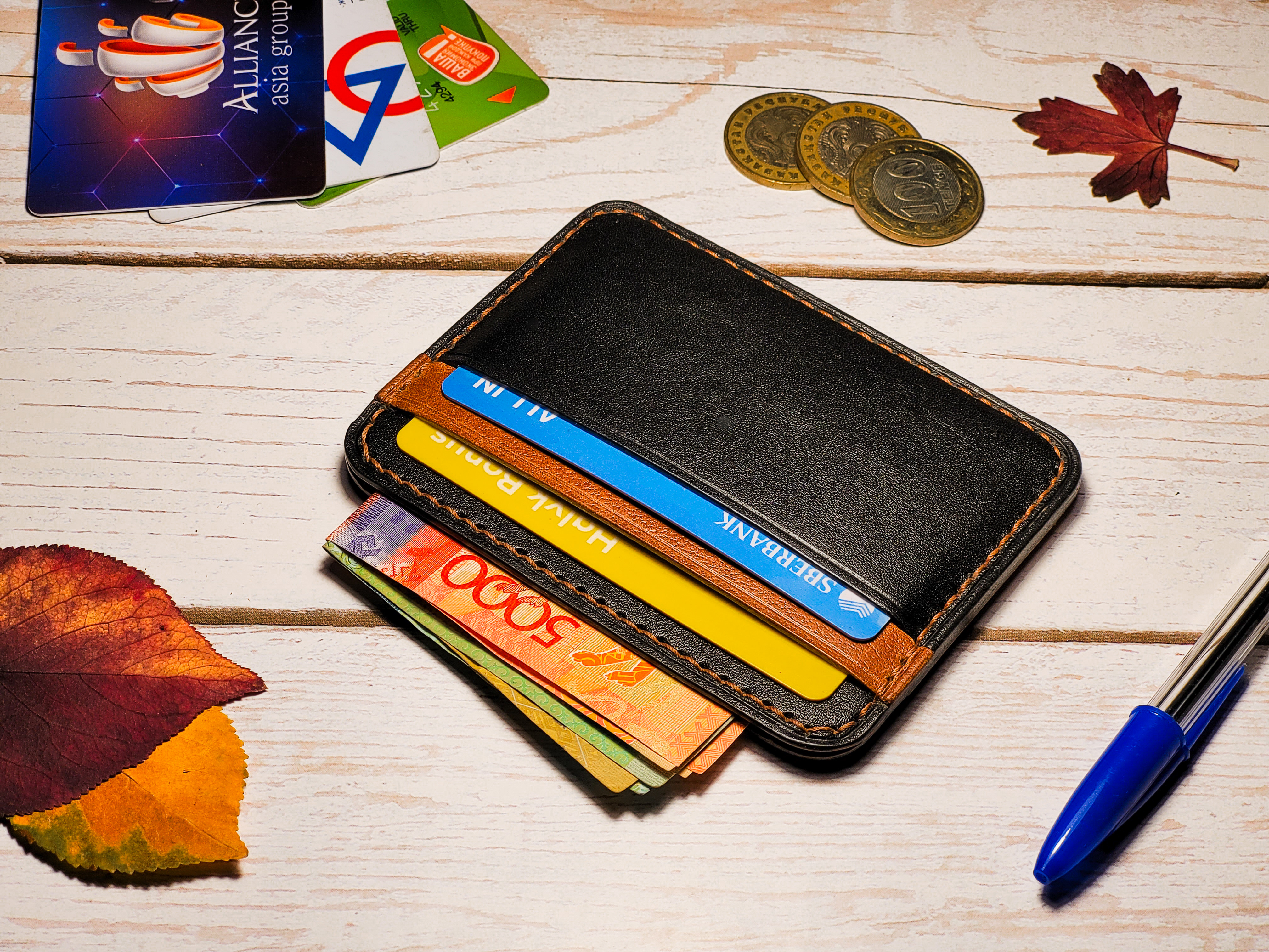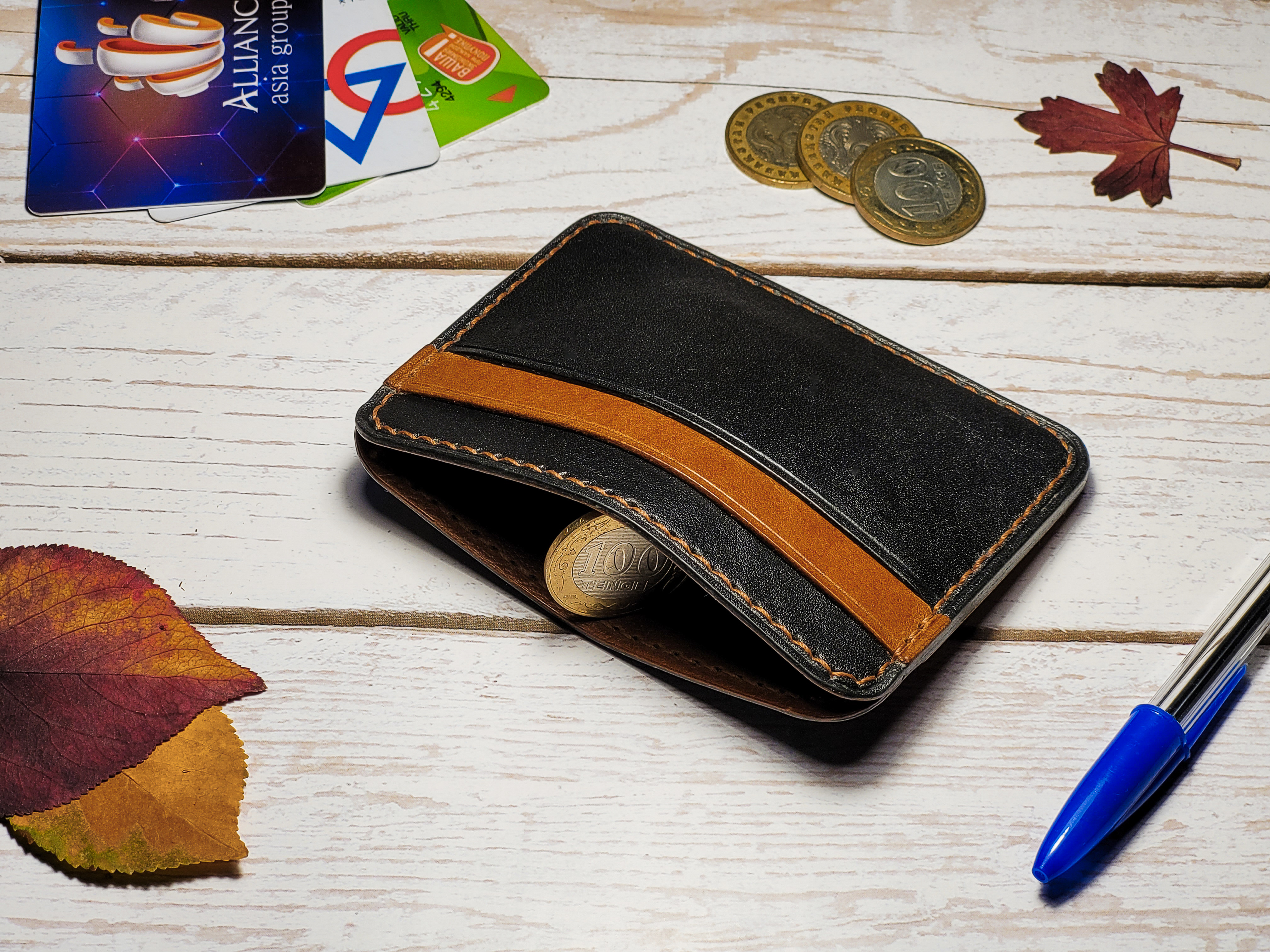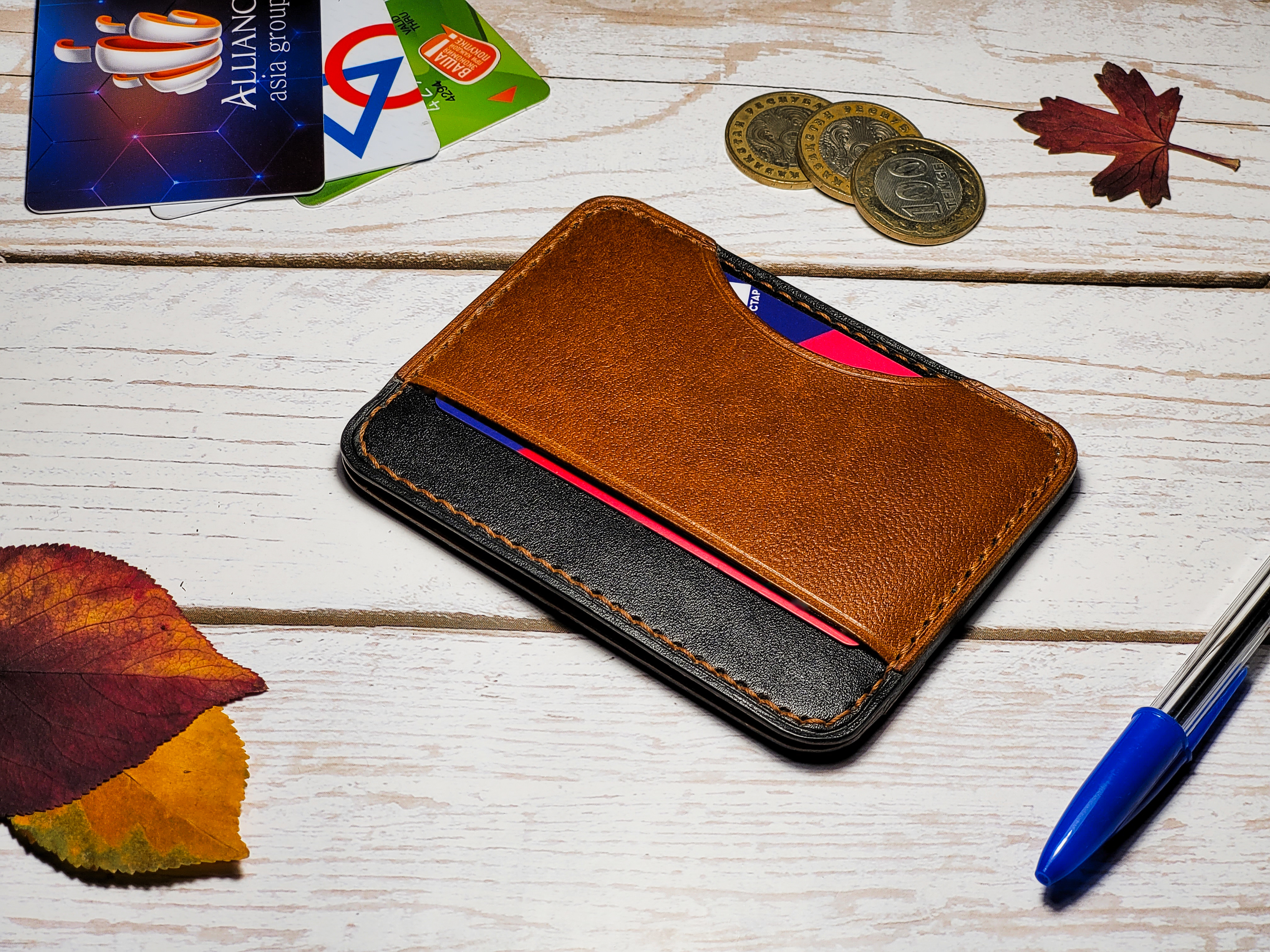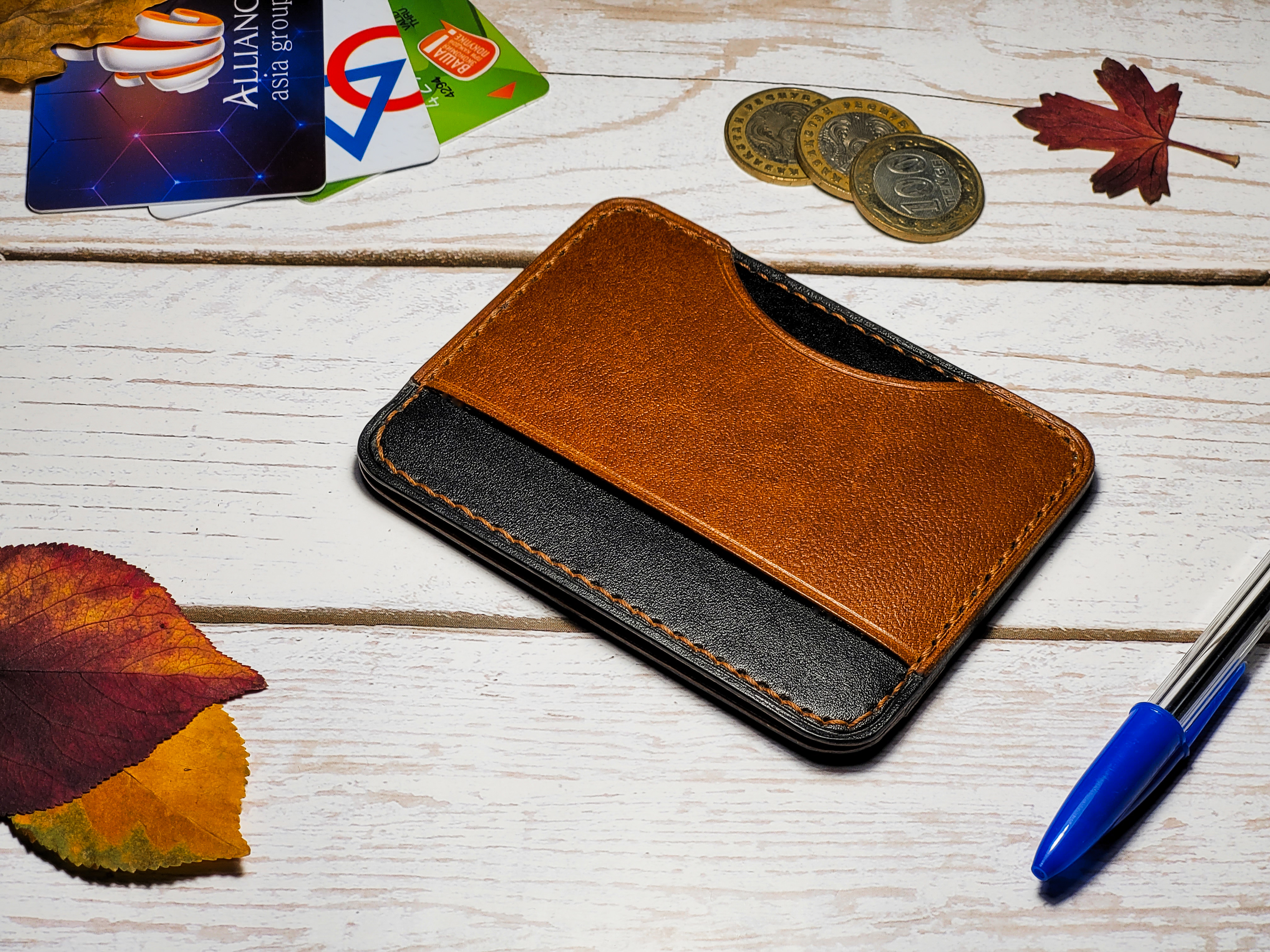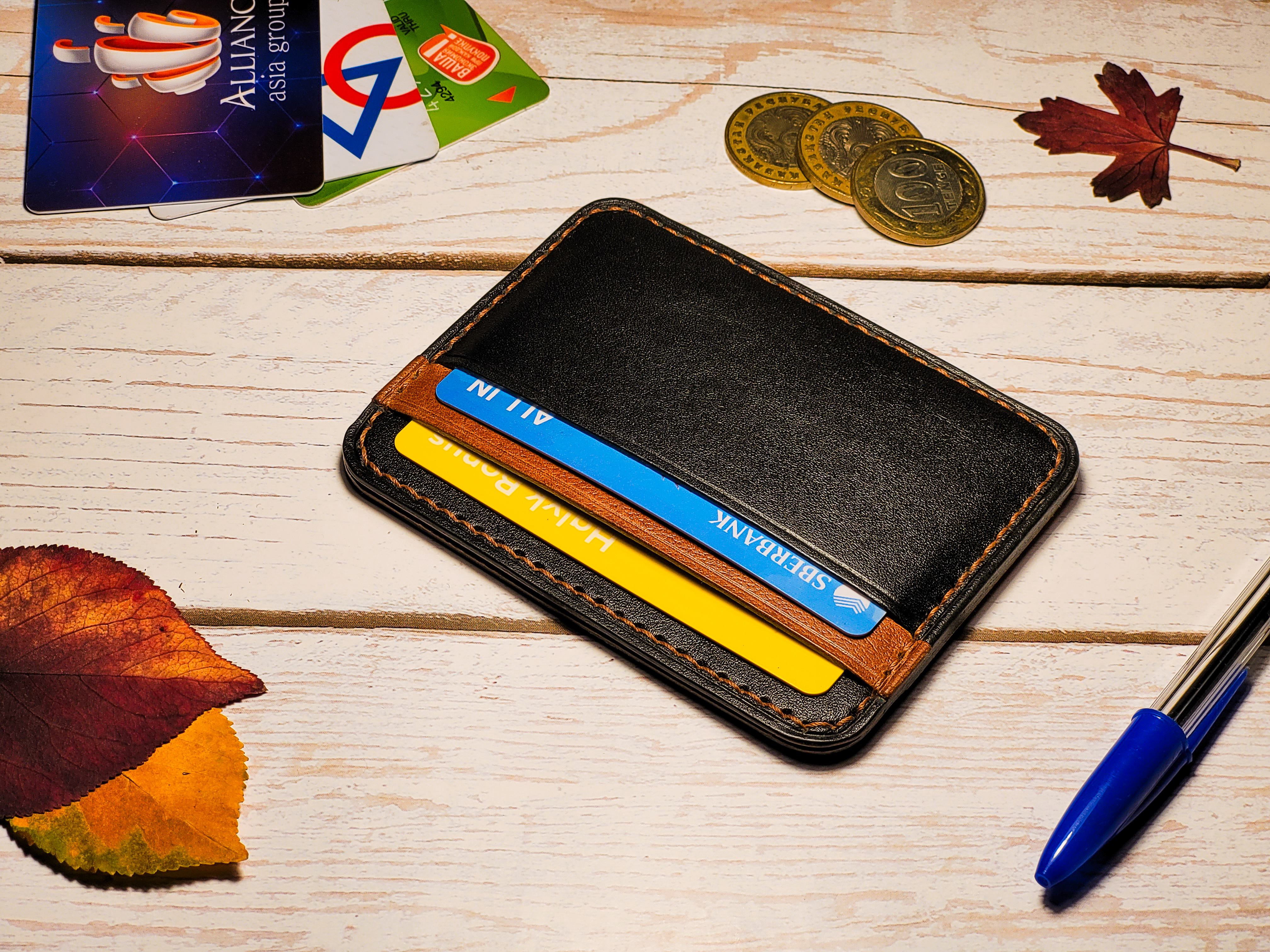 - Кардхолдер изготовлен из 100% натуральной кожи чёрного и коричневого цветов.